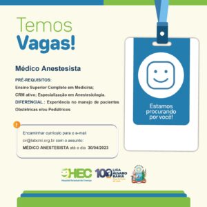 O Hospital Estadual da Criança (HEC), localizado em Feira de Santana, está com vaga aberta para a contratação de anestesista. Interessados devem encaminhar currículo para o e-mail cv@labcmi.org.br com o assunto: médico anestesista, até o dia 30 de abril.