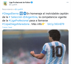 A morte do ex jogador Diego Maradona ocorreu nesta quarta-feira (25). Segundo o jornal “Clarín”, da Argentina, Diego Maradona faleceu após uma parada cardiorrespiratória em em sua casa, porém as homenagens e tributos ao ídolo continuam acontecendo, principalmente na Argentina. Ainda na noite da sua morte a AFA, entidade máxima do futebol do país, anunciou que o atual Campeonato Argentino se chamará Copa Diego Armando Maradona.