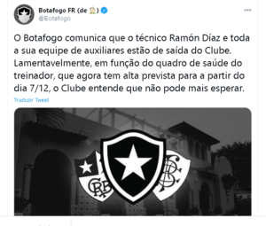O Botafogo de Futebol e Regatas comunica que o técnico Ramón Díaz e toda a sua equipe de auxiliares estão de saída do Clube. Lamentavelmente, em função do quadro de saúde do treinador argentino, que agora tem alta prevista para a partir do dia 7/12, o Clube entende que não pode mais esperar.