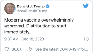 “A vacina da Moderna foi aprovada por esmagadora maioria. A distribuição deve começar imediatamente”, escreveu no Twitter.